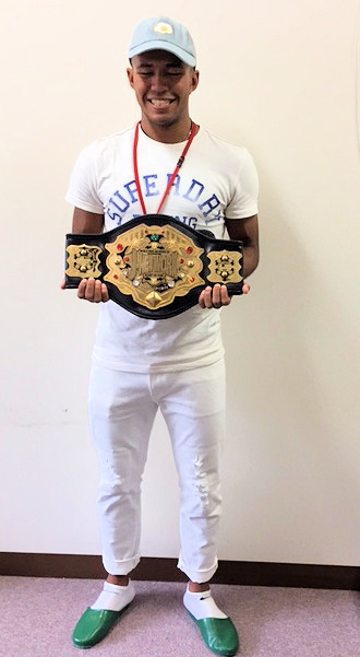 チャンピオンベルトを持つベイノア君(同窓会事務室にて)