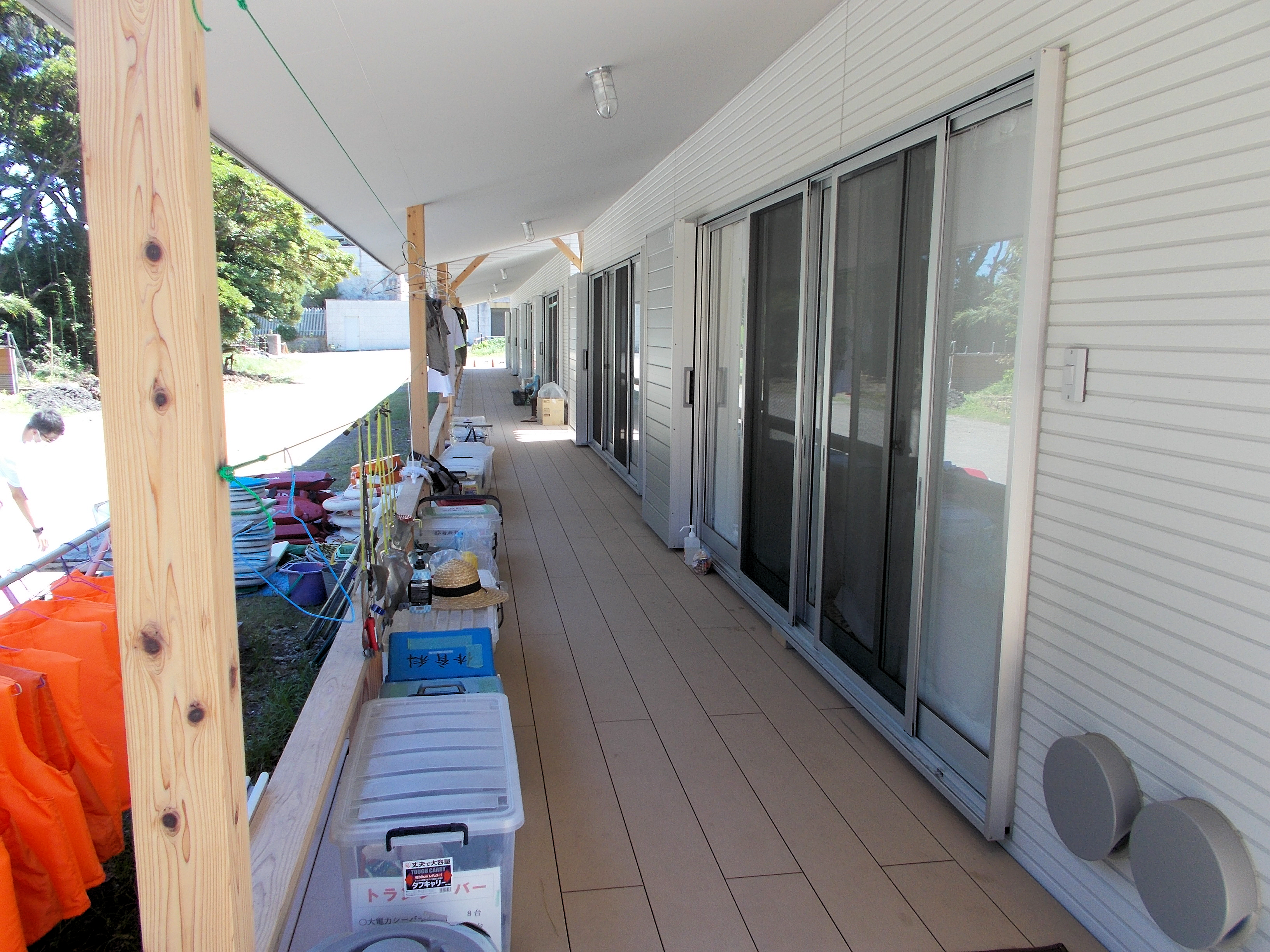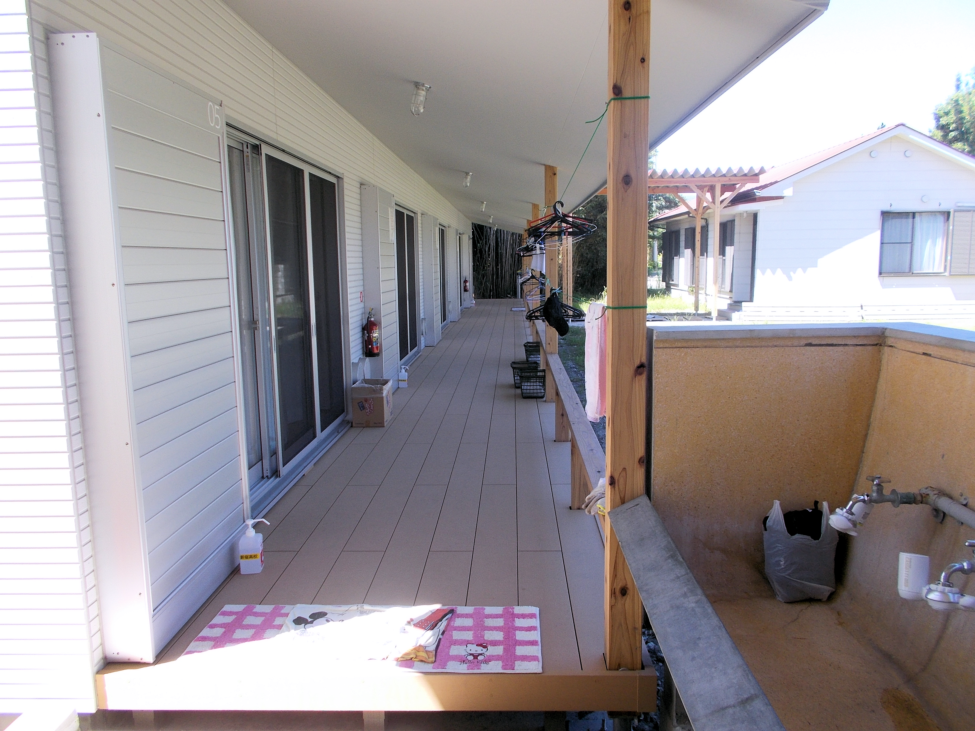 女子棟廊下からの眺め。右奥の白い建物は従来「新築棟」と呼んでいた台風被害を免れた建物