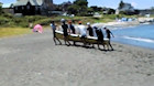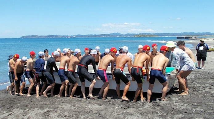 遠泳に伴走した和船を海から引き上げ