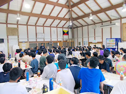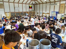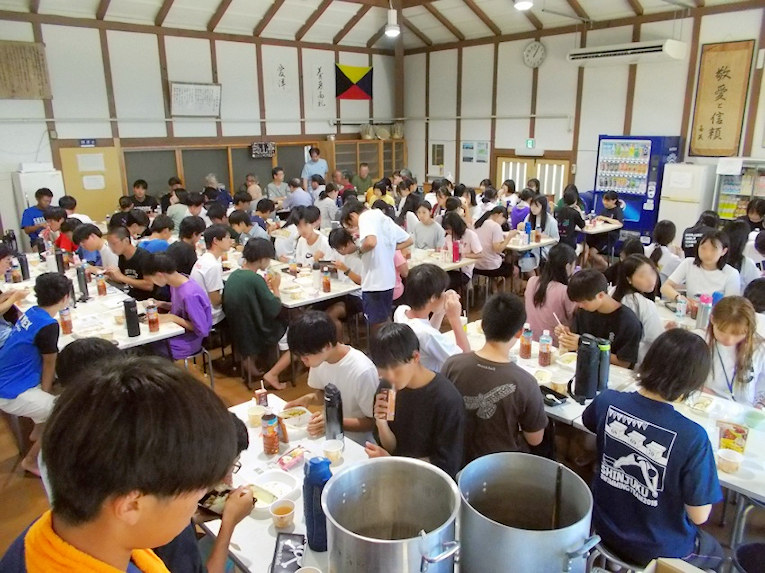 食堂での昼食風景、大遠泳のあとは恒例のカレーです。