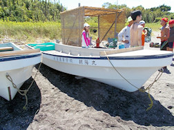 トラブルがあったとき、遠泳参加者全員が船(ボートと和船)に乗れるように、万全を期して地元の漁業協同組合長の大きな和船にも助けていただきます。