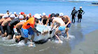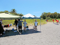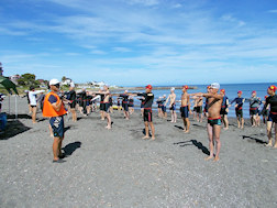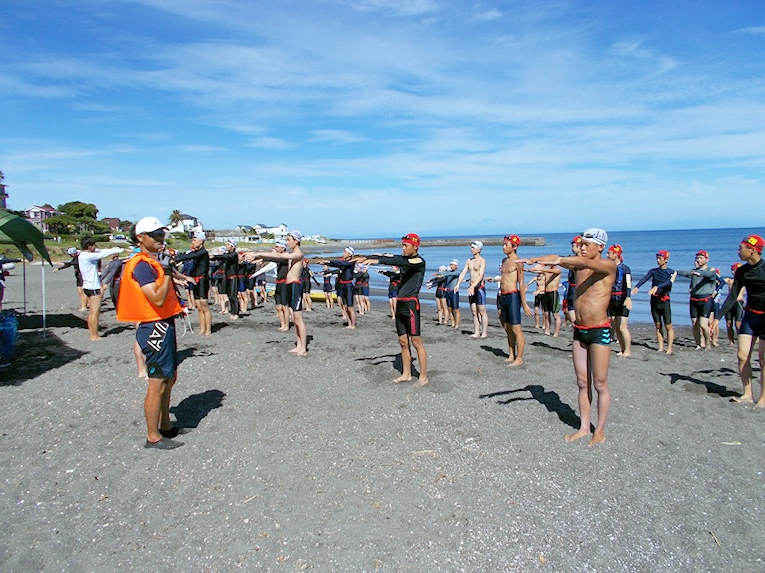 遠泳出発前、浜で入念な準備体操。