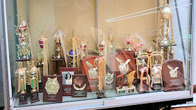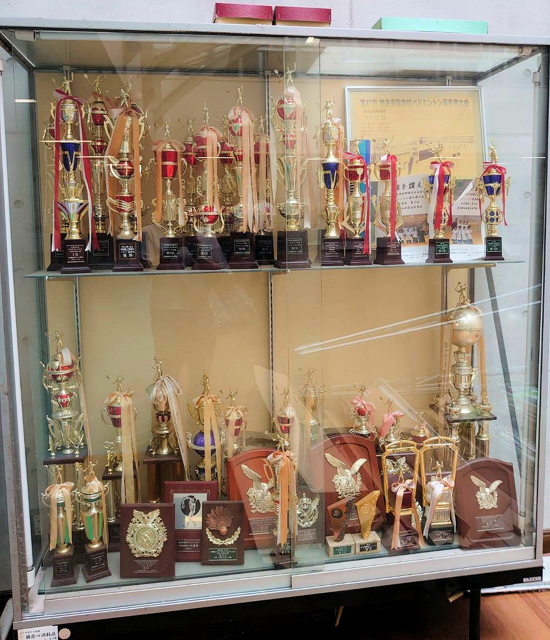 校舎エントランス(ピロティ)に飾られているトロフィーの数々
